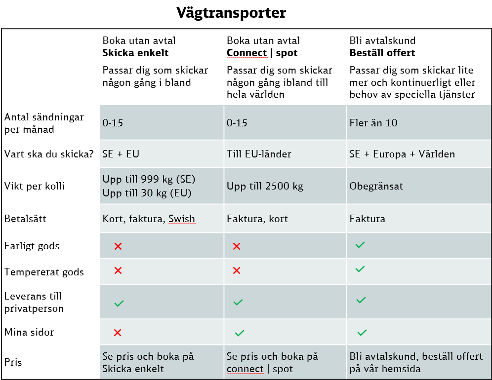 Som avtalskund får du tillgång till alla våra transporttjänster och tillval inom Sverige och till/från Europa och världen, däribland transport av t.ex. farligt gods eller vätska.