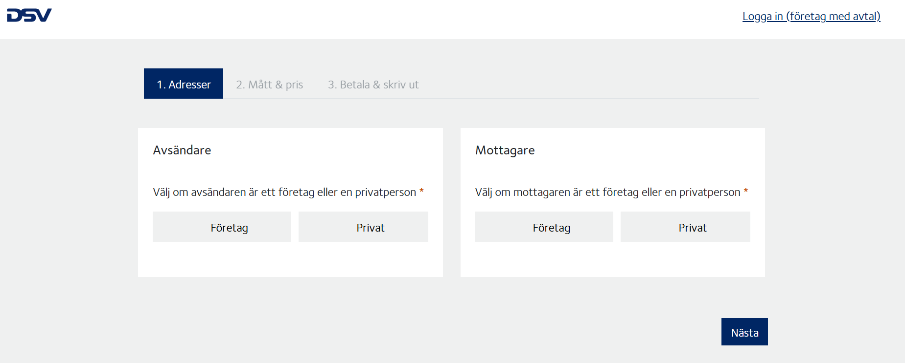 Välj om du som avsändare är ett företag eller privatperson, samt ange adress och kontaktuppgifter.
