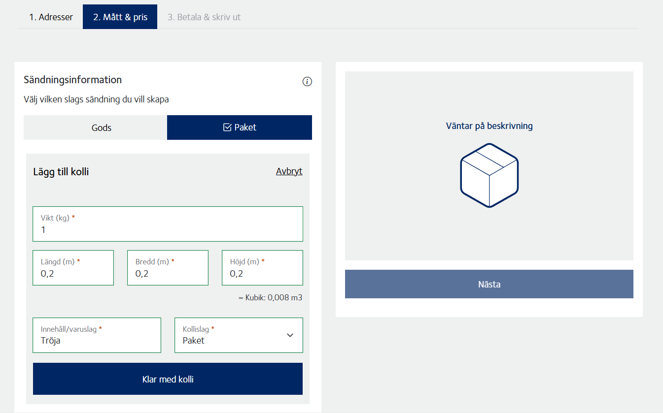 Fyll i vikt, längd, bredd och höjd på din sändning. Observera att du ska ange mått i meter!
