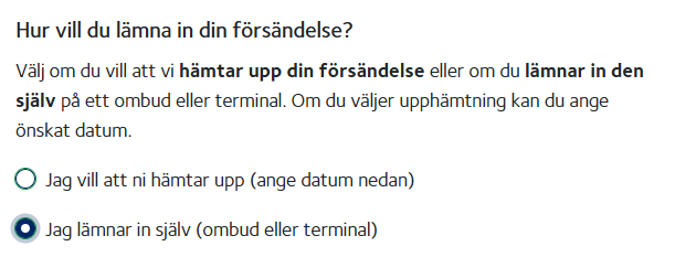 Välj hur du vill lämna in din sändning och om du är ett företag så kan du boka upphämtning.