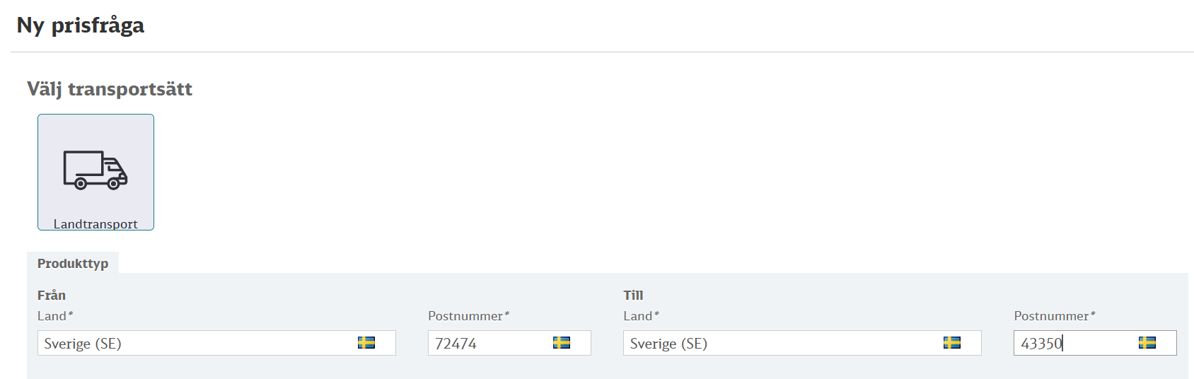 När samtliga stjärnmarkerade fält är ifyllda, godkänn villkoren och generera prisfrågan genom att klicka Begär pris.